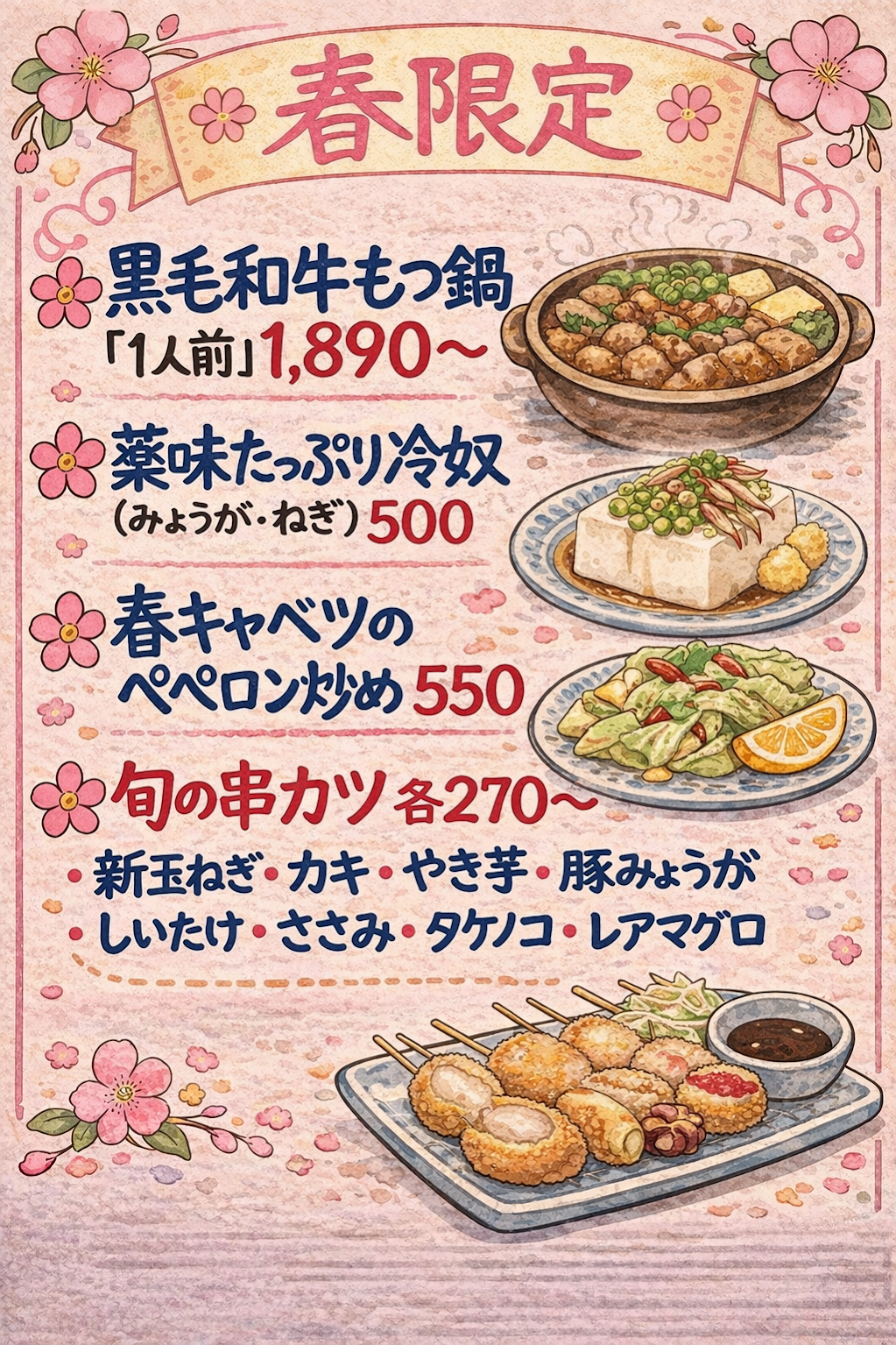 さらに、黒毛和牛もつ鍋、薬味たっぷり冷奴、春キャベツのペペロン炒め、旬の串カツもおすすめです。